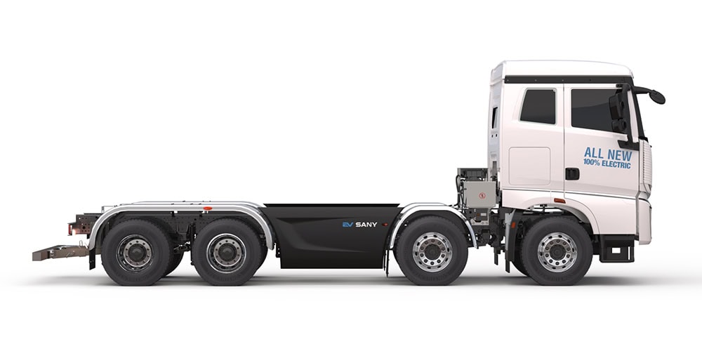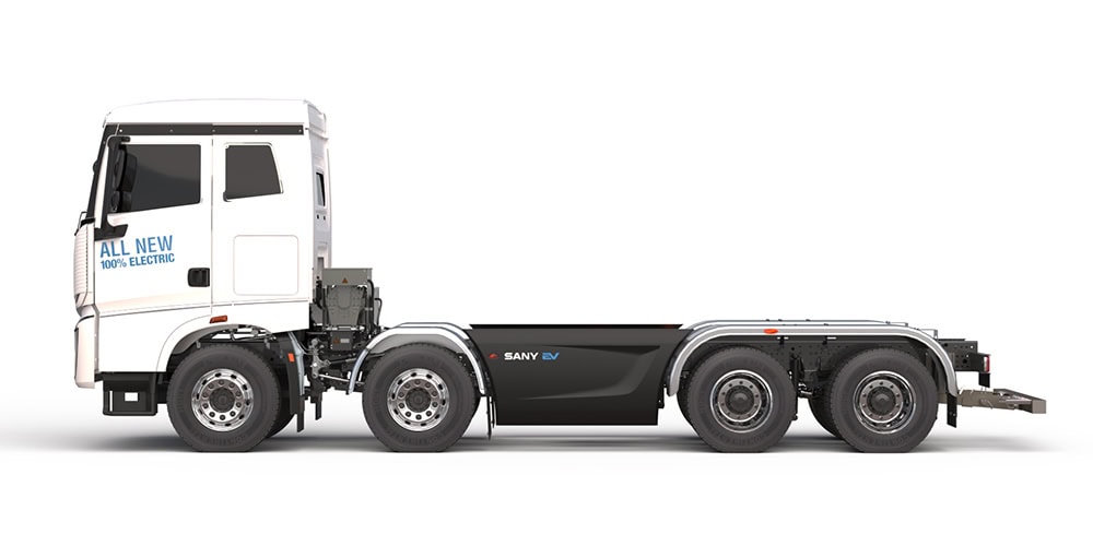 eTruck SANY completamente elettrico di ultima generazione con 4 assi e capacità della batteria di 350 kWh.